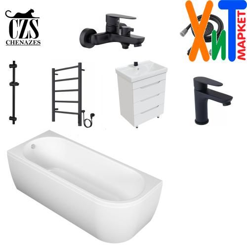 Ванная комната комплект Chenazes 4500 чёрный с электрическим полотенцесушителем собрал в себе оптимальный набор качественной сантехники, частично выполненной в чёрном цвете. Контраст белого и чёрного цвета - классический подход к дизайну ванной комнаты.